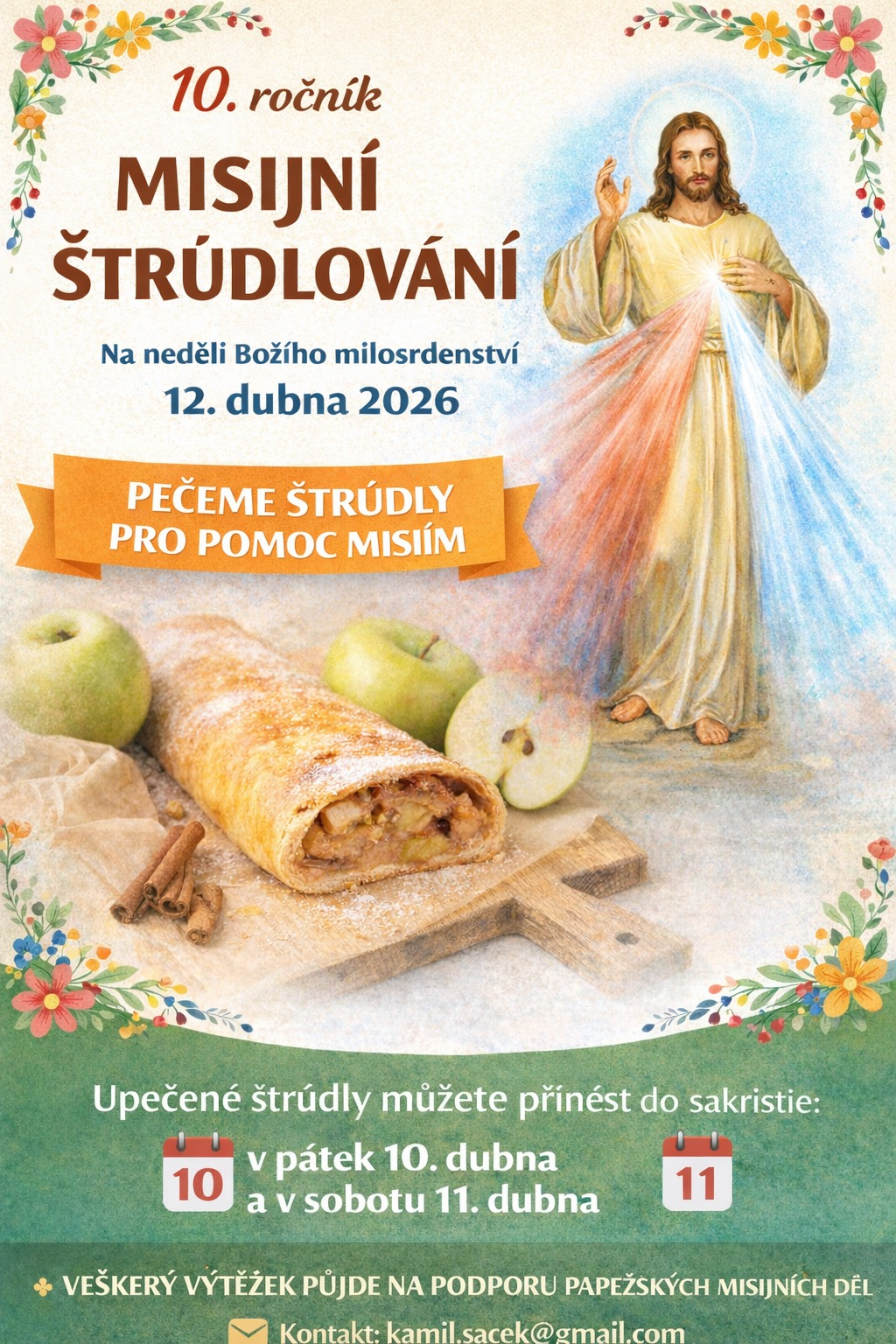 10. ročník Misijního štrúdlování se uskuteční na neděli Božího milosrdenství 12. dubna. Kdo se bude chtít zapojit napečením štrúdlů či jiných závinů, může v pátek a v sobotu 10. a 11. dubna přinést výrobek do sakristie. (příloha - png, 2.8 MB)