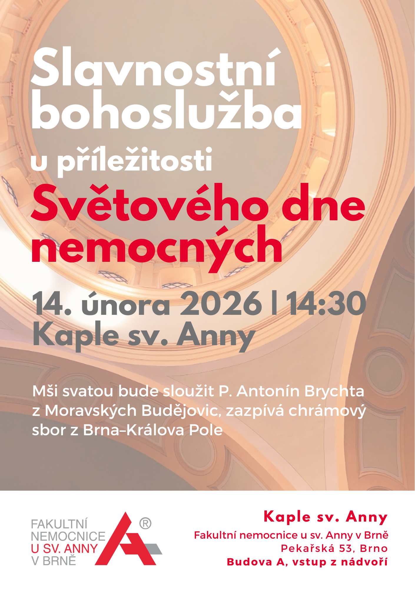 | 14/2/2026 | 14:30 | Mše ke Světovému dni nemocnýcho | Brno-Střed | Kaple ve Fak. nemocnici u sv. Anny | program plakát (png, 1.6 MB) |